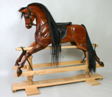 The big brother of the horse above is the large mahogany rocking horse, which is also presented here with a different head posture to its stablemate but with the same outstanding qualities of sheen and detail. |